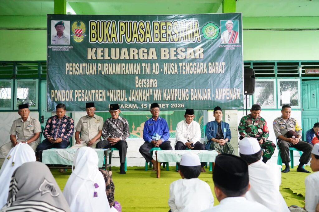 Mataram, Suarasamawa.com– Persatuan Purnawirawan TNI Angkatan Darat (PPAD) Provinsi Nusa Tenggara Barat menggelar kegiatan Buka Puasa Bersama dan Bakti Sosial bersama para santri dan masyarakat di Pondok Pesantren Nurul Jannah Nahdlatul Wathan, Ampenan, Kota Mataram, Minggu (16/3/2026).