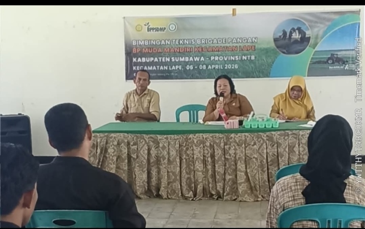Sumbawa-Besar,Suarasamawa.com– Dinas Pertanian Kabupaten Sumbawa menggelar Bimbingan Teknis (Bintek) Brigade Pangan di Aula Kantor Kecamatan Lape, Senin (06/04/2026). Kegiatan yang diikuti puluhan petani muda dan penyuluh lapangan itu dipimpin langsung oleh Kepala Dinas Pertanian Sumbawa, Ir Ni Wayan Rusmawati, M.Si.